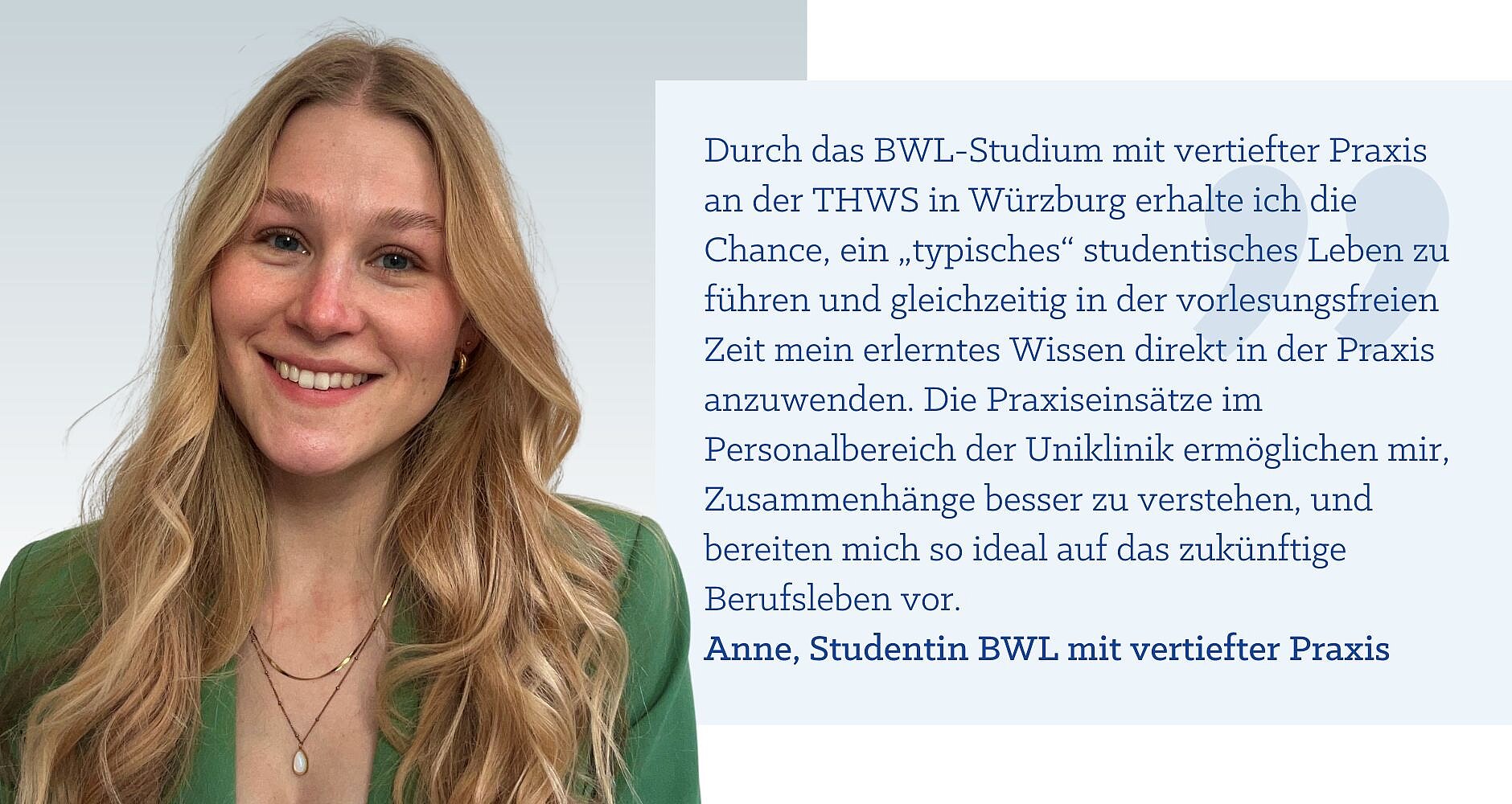 - Die Kombination von Praxiserfahrung und Studium, das ist für viele von großer Bedeutung. Das Universitätsklinikum Würzburg bietet die Möglichkeit ein BWL-Studium mit vertiefter Praxis (Schwerpunkt Personalmanagement) an der Technischen Hochschule Würzburg-Schweinfurt zu absolvieren. Während der vorlesungsfreien Zeit finden die Praxiseinsätze bei uns am Klinikum statt. Im Rahmen der Theoriephasen werden die wichtigen Bereiche der Betriebswirtschaftslehre vermittelt. Die allgemeine betriebswirtschaftliche Ausrichtung eröffnet berufliche Perspektiven in weiteren Bereichen. Durch den Schwerpunkt Personalmanagement wird in den Vorlesungen verstärkt auf die Aspekte im Personalbereich eingegangen, wodurch eine gute Vorbereitung für den späteren Beruf geschaffen wird.