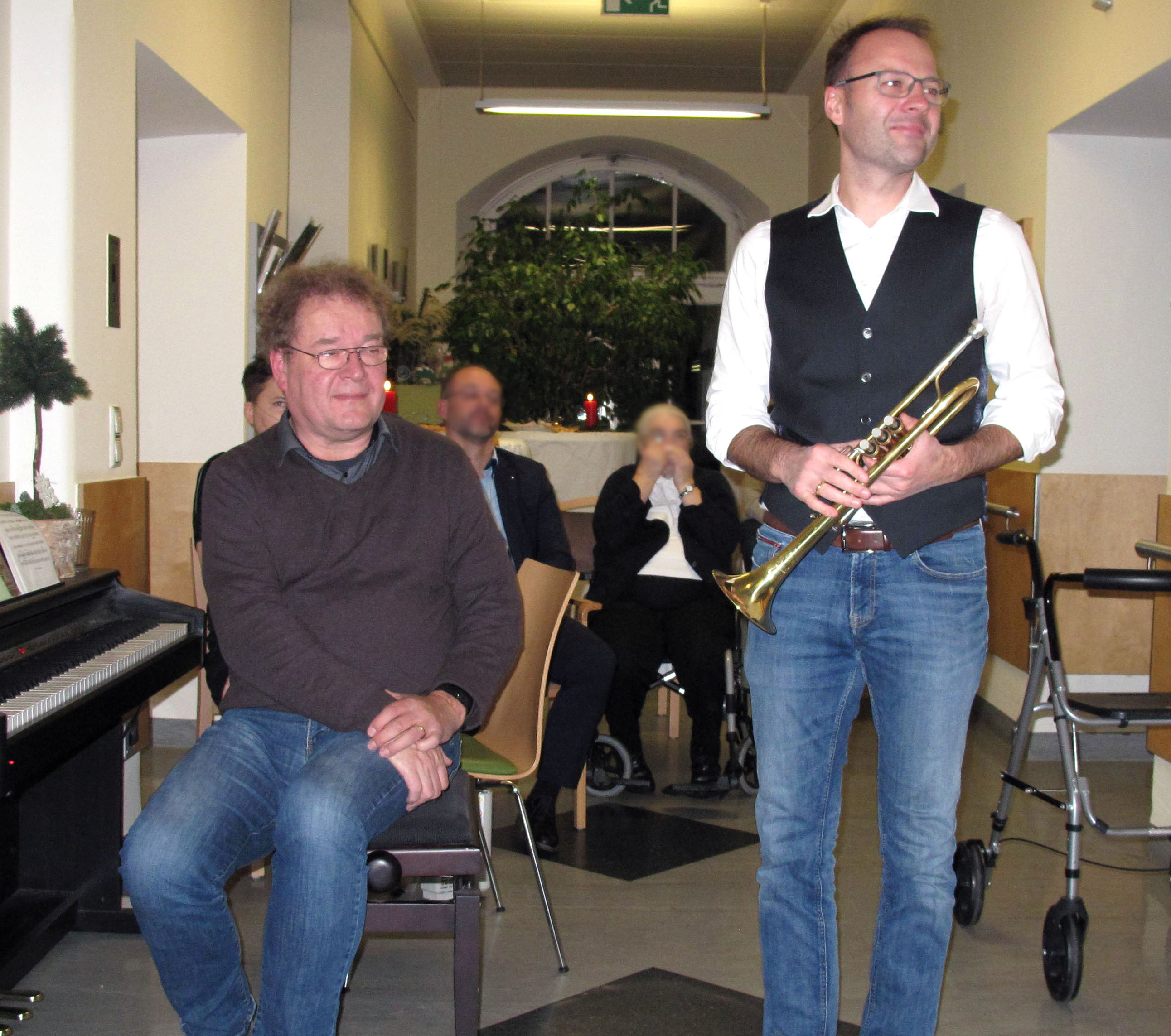 Es ist mittlerweile schon eine kleine Tradition: Im Advent bringen Musikerinnen und Musiker vorweihnachtliche Stimmung auf die Palliativstation des Uniklinikums Würzburg (UKW). In diesem Jahr waren Johannes Mauer, Solotrompeter am Mainfrankentheater, und Gregor Frede, Diözesanmusikdirektor im Bistum Würzburg, am Klavier, bereits zum dritten Mal zu Gast. Sie präsentierten am 9. Dezember meisterliche Werke des Barock. Außerdem luden sie die Anwesenden zum Adventssingen ein. Mobile Patienten kamen für das etwa 45-minütige Konzert in den Flur der Station. Die Bettlägerigen konnten durch ihre offenen Zimmertüren an dem Musikgenuss teilhaben. Der Nachmittag klang anschließend bei Glühwein und Plätzchen in Gemeinschaft aus. Interessierte hatten zudem Gelegenheit, die Station zu besichtigen.