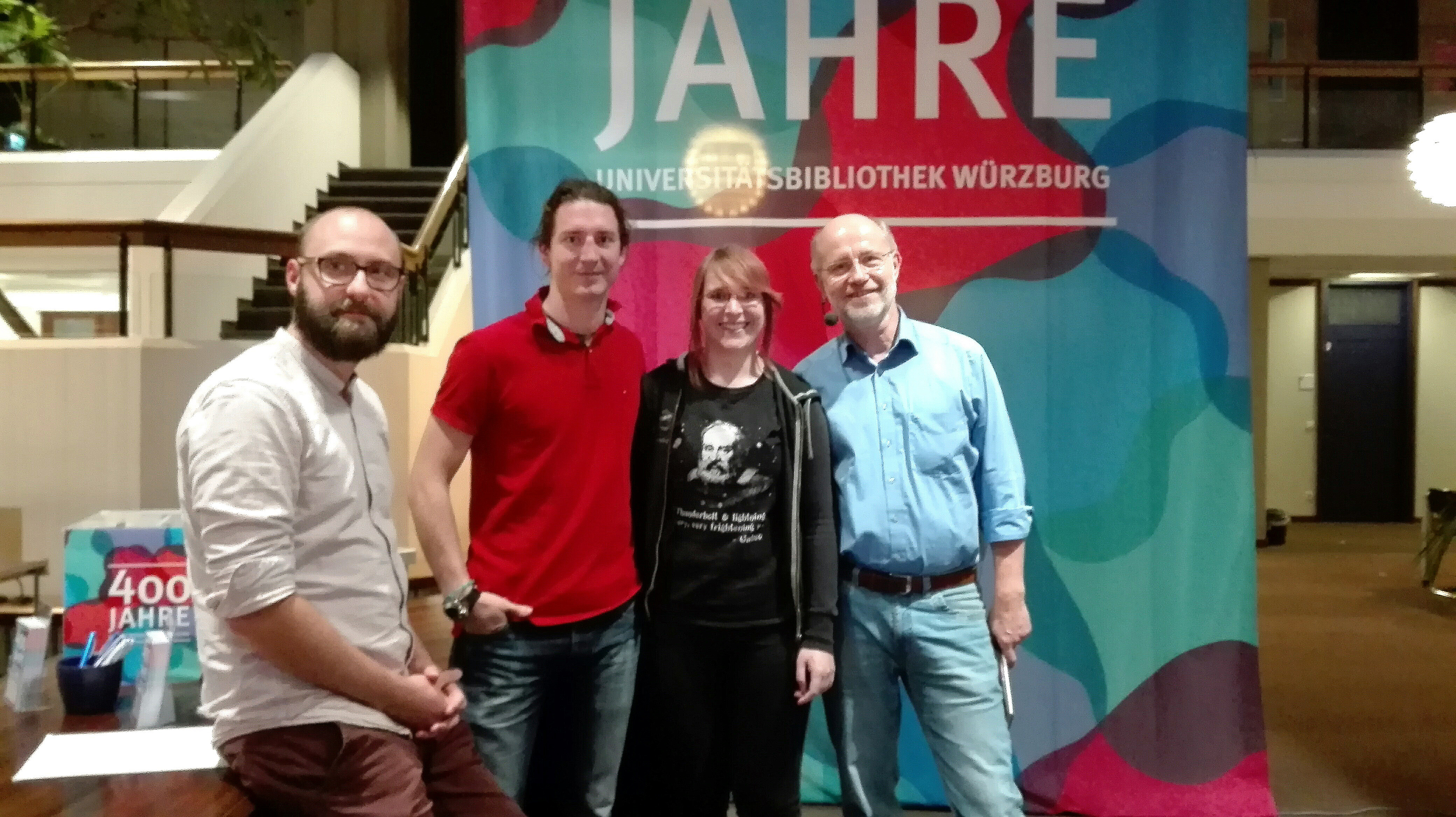 Nach gut eineinhalb Stunden neigt sich der intergalaktische Flug dem Ende entgegen. Vielleicht schreiben sie ja noch einmal ein gemeinsames Buch, fragen die Zuhörer. Ja, wenn es die Zeit erlaubt und sich ein geeignetes Thema finden ließe, so das Credo der Autoren, die mit der „Entdeckung der Gravitationswellen“ nach ihrem ersten Gemeinschaftswerk „Die Entdeckung des Higgs-Teilchens“ aufs Neue gezeigt haben, dass Wissenschaft kein Elfenbeinturm sein darf, sondern dazu verpflichtet ist, der Gesellschaft wissenschaftliche Erkenntnisse auf verständliche Art und Weise zu vermitteln. Und gäbe es einen passenderen Ort für diese Art der Vermittlung als die Universitätsbibliothek Würzburg, die „nicht nur ein Buchaufbewahrungscontainer“ sei, wie der Leiter der Universitätsbibliothek, Hans-Günter Schmidt, in seiner Begrüßung betonte: „Wir sind als Universitätsbibliothek auch ein Forum des Austauschs. Wir bieten Information an, kostenlos, damit sich jede und jeder selbst ein Bild machen kann von der Welt, wissen kann, ungefiltert.“ Die 500 Besucher am Freitagabend wollten sich das Angebot nicht entgehen lassen: Sie wollten verstehen und sich auf hohem wissenschaftlichen Niveau unterhalten lassen. Das ist Harald Lesch und seinen ehemaligen Studierenden bestens gelungen. Herzlichen Dank und gerne mal wieder!