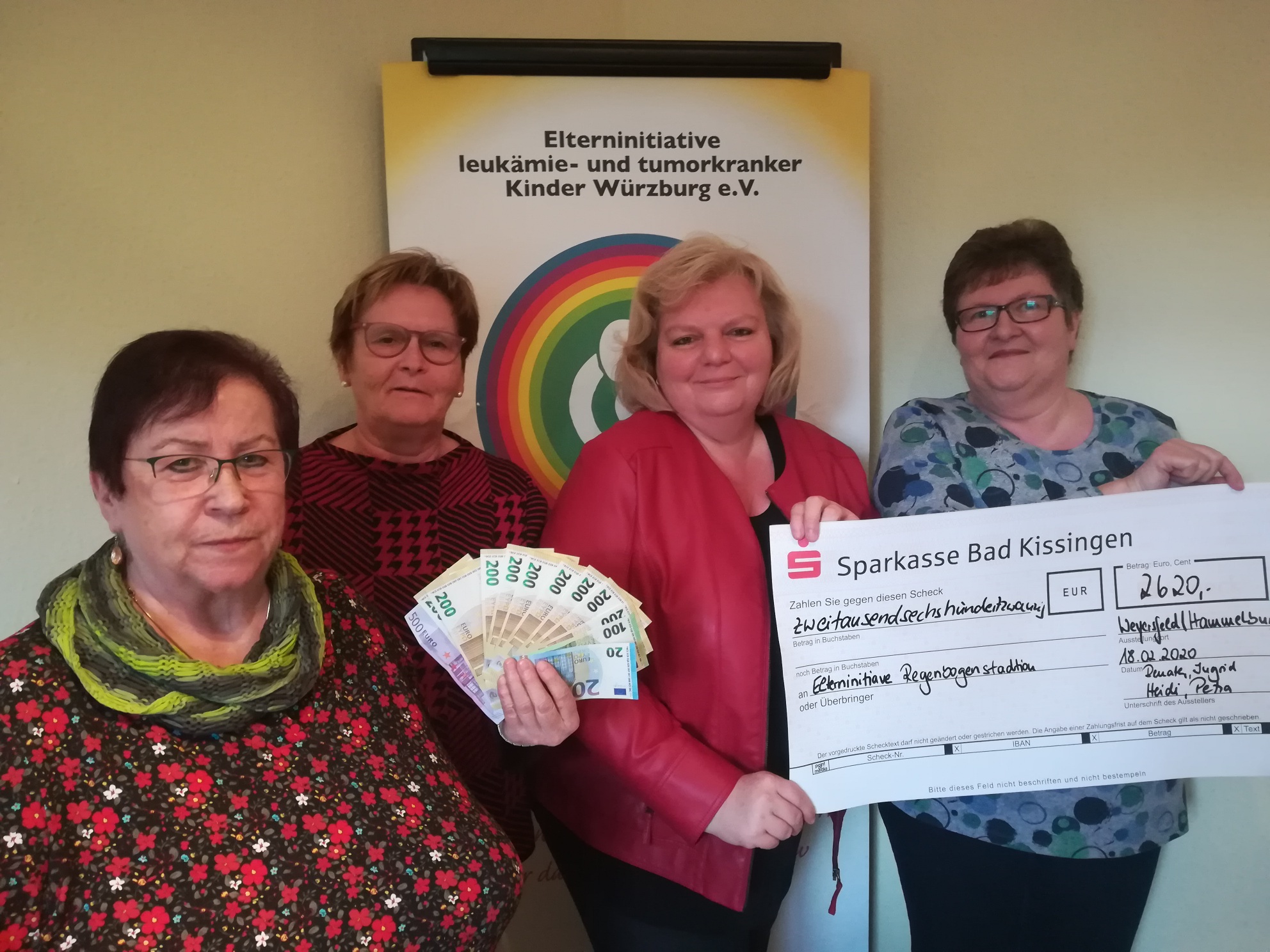 In der Adventszeit „betrieben“ Hobbyhandwerkerinnen aus dem Raum Hammelburg/Weyersfeld im Zentrum für Operative Medizin (ZOM) des Uniklinikums Würzburg einen Adventsbasar für den guten Zweck. Durch den Verkauf von gestrickten Socken, Mützen und Stulpen, Holzarbeiten, Weihnachtsgestecken, Adventskränzen, Kissen, Plätzchen, Quarkstollen und vielem mehr kamen insgesamt 2.620 Euro zusammen. Diese Summe überreichten die fleißigen Damen nun der Elterninitiative leukämie- und tumorkranker Kinder e.V., die damit die Familien unterstützen, deren Kinder auf den onkologischen Stationen Regenbogen, Schatzinsel und Leuchtturm der Würzburger Universitäts-Kinderklinik behandelt werden.
