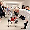 Würzburg. HELIA ist noch etwas ungelenk, stakst mit lauten Schritten durch die Flure und bewegt sich ausschließlich nach den Impulsen der Fernsteuerung. Aber schon bei ihrem ersten Auftritt auf der Station H21/22 der Hautklinik am Uniklinikum Würzburg (UKW) flogen der roten Roboterhündin mit den silbernen Beinchen alle Herzen zu. Pflegekräfte, Reinigungspersonal, Ärztinnen und Ärzte sowie Patientinnen und Patienten zückten ihre Handys oder reckten die Hände, um HELIA zu streicheln oder zumindest ein Bild von ihr zu machen. HELIA steht für „Helfender Roboter im Klinikalltag“. Wie genau der vierbeinige Roboter im Klinikalltag eingesetzt werden kann und darf, das testet das UKW in den kommenden drei Jahren gemeinsam mit dem Karlsruher Institut für Technologie (KIT), dem FZI Forschungszentrum Informatik und dem Forschungszentrum Jülich (FZJ).