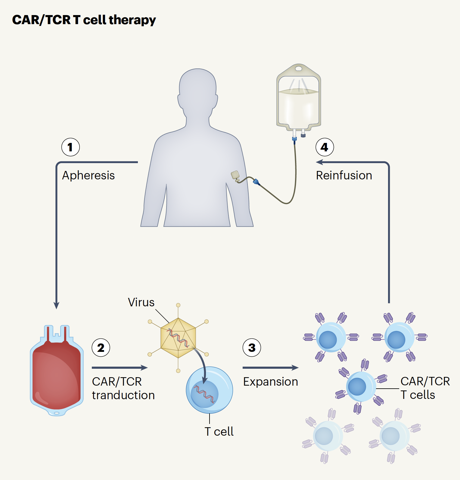 CAR (Chimeric Antigen Receptor) and TCR (T Cell Receptor) T cell therapies represent one of the most exciting breakthroughs in modern medicine. In this approach, a patient’s own T cells are collected, genetically engineered to express a CAR/TCR, expanded, and reinfused to seek and destroy tumor cells (Fig. 1).