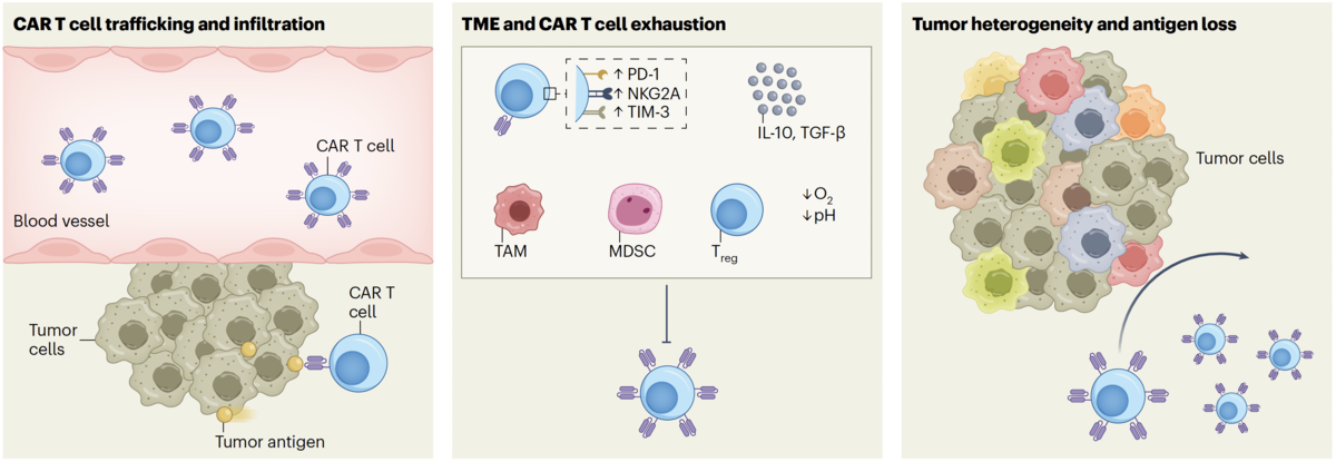 - The solid tumor microenvironment suppresses T cell function, leading to engineered cell exhaustion.