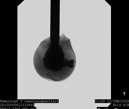 Our research currently focuses on optimizing mineral bone cements for clinical use. The necessary basic components for calcium phosphate and magnesium phosphate cements are combined in such a way that the desired properties – such as sufficient viscosity for injection and subsequent hardening with high load-bearing capacity – are optimized.