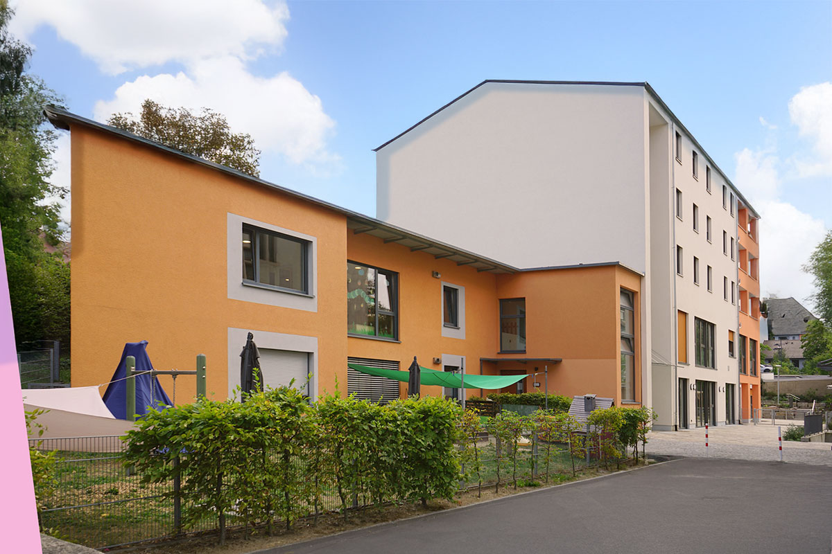 Im Vordergrund das Bestandsgebäude der Kinderkrippe. Im Hintergrund der Neubau mit Wohngruppe und Kindergarten.