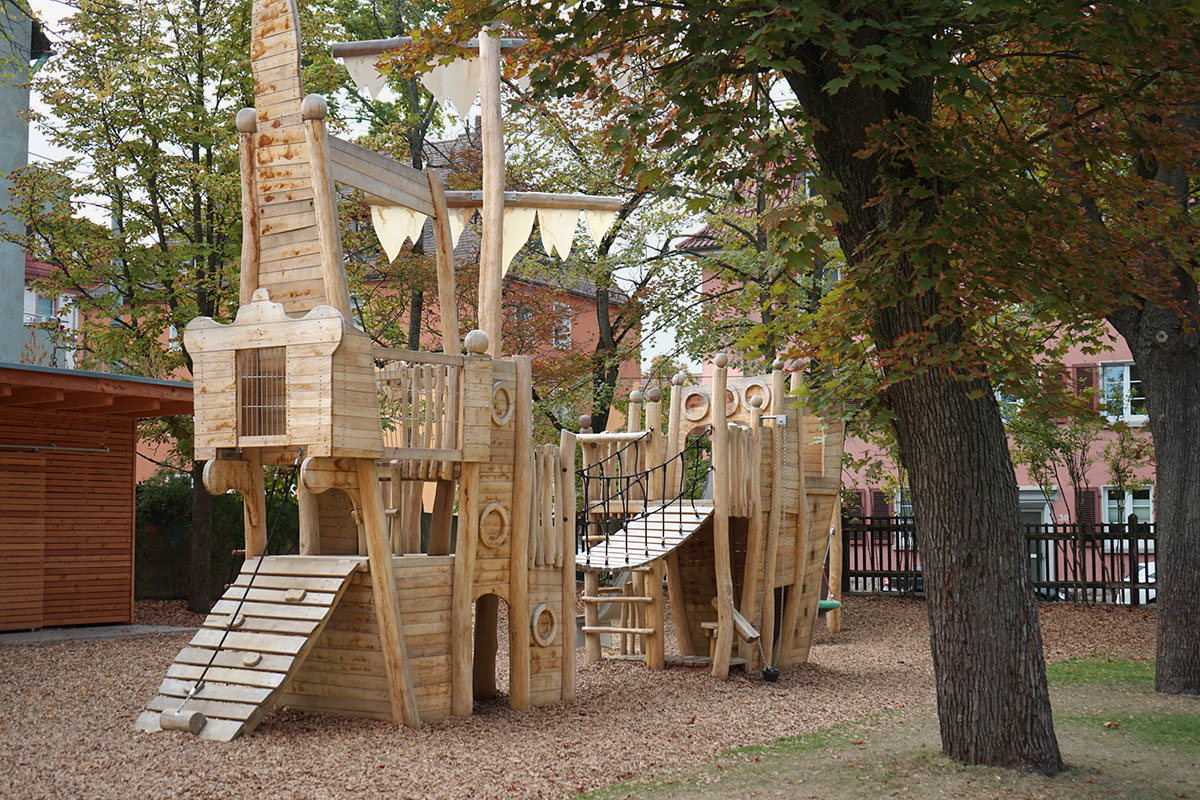 Ein großes Spielschiff prägt das an Ostern 2025 in Betrieb genommene Außengelände des Kindergartens.