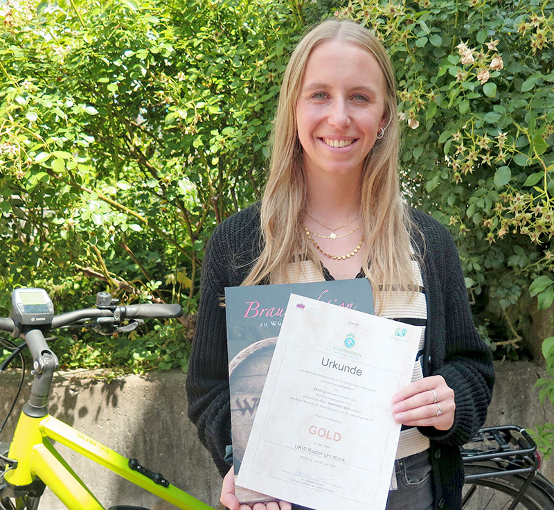 Stadtradeln ist ein bundesweiter Wettbewerb, bei dem es darum geht, 21 Tage lang möglichst viele Alltagswege klimafreundlich mit dem Fahrrad zurückzulegen. In Würzburg beteiligten sich an der diesjährigen Neuauflage zwischen dem 1. und 21. Mai 171 Teams, darunter die UKW-Radler. Deren 266 Aktive kamen im Auswertungszeitraum auf knapp 57.000 km. Im Vergleich zu einem PKW wurden der Atmosphäre dadurch über 9.300 kg an Kohlendioxid-Emissionen erspart. Mit dieser Leistung kam die UKW-Mannschaft in der Kategorie „Unternehmenswettbewerb“ auf den ersten Platz. Bei der Preisverleihung am 9. Juli an der Umweltstation der Stadt Würzburg nahm Sabrina Seitz, Team-Organisatorin aus dem Betrieblichen Gesundheitsmanagement des UKW (im Bild), eine Urkunde sowie einen Getränkegutschein der Würzburger Hofbräu entgegen.