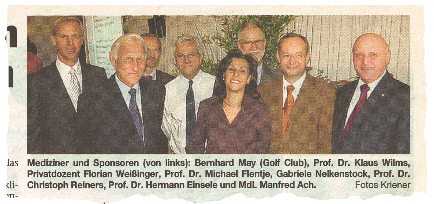 Startpunkt des Zentrums für Stammzelltransplantationen war die Einweihung eines Neubaus auf dem Klinikumscampus an der Josef-Schneider-Straße im Jahr 2005. Die Kosten des 7,3 Millionen Euro teuren Gebäudes D30 teilten sich das Land Bayern und die Bundesrepublik Deutschland hälftig. Die Finanzierungszusage des Freistaats wurde durch eine außergewöhnliche Spendenaktion angestoßen. Dabei leistete die von der Würzburger Geschäftsfrau Gabriele Nelkenstock ins Leben gerufene „Aktion Stammzelltherapie“ wesentliche Starthilfe. Ihrer Bürgerbewegung gelang es, in Zusammenarbeit mit Christel Lochner, der Vorsitzenden der Elterninitiative leukämie- und tumorkranker Kinder Würzburg e.V., mit vielen Aktionen über 500.000 Euro – damals über eine Million D-Mark – in der Region zu sammeln. „Diese Erfolgsgeschichte war nur möglich, weil seinerzeit Bürgerschaft und Politik, namentlich der bayerische Landtagsabgeordnete Manfred Ach, am gleichen Strang zogen“, erinnert sich Nelkenstock. Das Bild oben entstand bei einer Dankveranstaltung für die Spenderinnen und Spender im Würzburger Golf Club im Juli 2005.