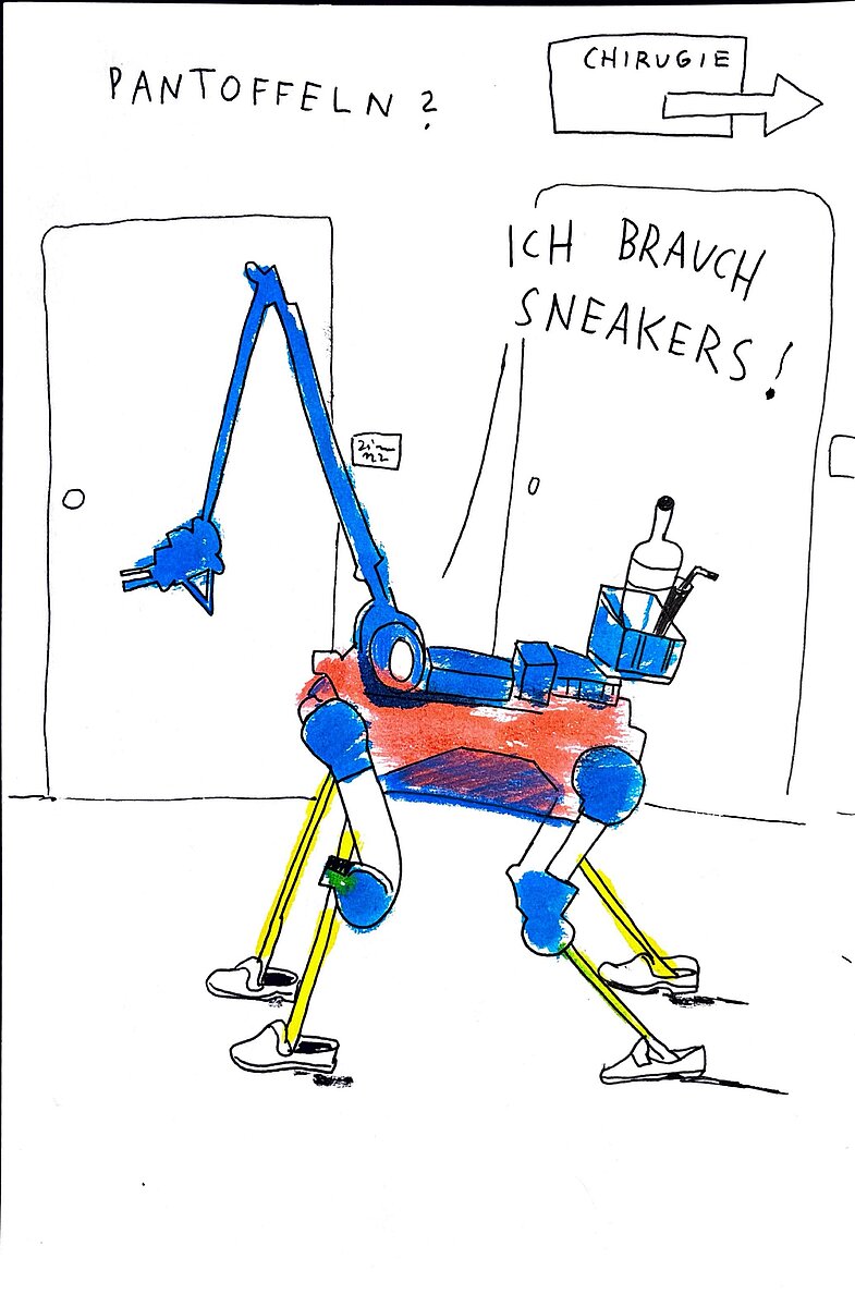 Nach ihrem gelungenen Debüt auf der Station kehrt HELIA zurück ins Körbchen in der Bibliothek der Dermatologie, wo sie in Ruhe ihre Batterien auflädt. Auf der Station wird hingegen eifrig diskutiert, welche Augen man dem Hund aufkleben soll und ob man HELIA ein Fässchen um den Hals hängen sollte - schließlich hat sie nicht nur die Größe eines Bernhardiners, sondern kommt auch aus der Schweiz. Der Roboterhund HELIA wurde von der Schweizer Firma ANYbotics entwickelt und heißt eigentlich ANYmal. Derzeit sind rund 200 der genannten ANYmals im Einsatz, allerdings primär dort, wo es für Menschen gefährlich ist. Als Inspektionsroboter überwachen sie Ölplattformen, Windparks oder Stahlwerke. Klinikstationen sind neu. „Da bei uns niemand mit einem Roboterhund rechnet, müssen wir am Eingang vor dem Hund warnen“, schmunzelt Astrid Schmieder. „Achtung, hier ist ein Roboterhund für Forschungszwecke im Einsatz!“