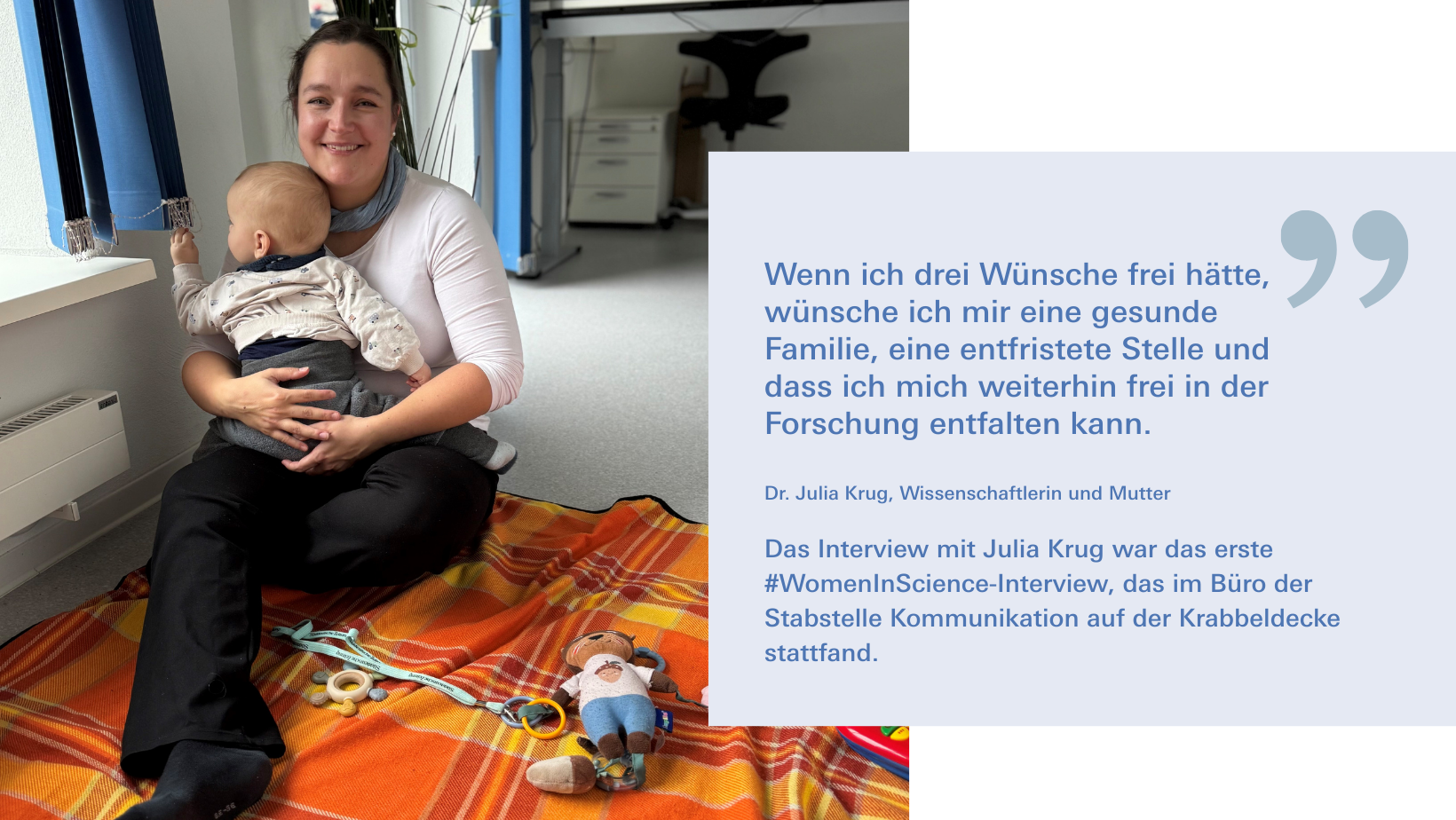 Unser Sohn Gregor wurde im Frühjahr 2025 hier am UKW geboren. Im Januar kehre ich wieder ins Arbeitsleben zurück. Mein Mann übernimmt dann die restliche Elternzeit und damit die Betreuung sowie die Krippeneingewöhnung. Die geteilte Care-Arbeit hatten wir bereits vor der Kinderplanung besprochen. Ich werde teilweise im Home-Office arbeiten und somit versuchen den Wiedereinstieg etwas sanfter zu gestalten. Ich bin gespannt.
