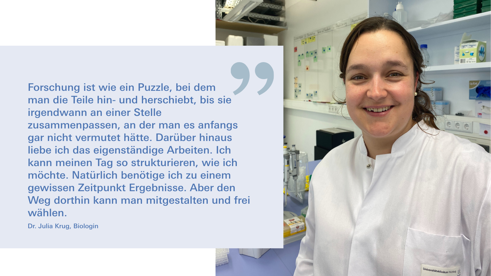 Ich finde es beeindruckend mit zu erleben, wie sich die Universitätsmedizin in den letzten Jahren in Würzburg entwickelt hat und zu wissenschaftlichen Innovationen maßgeblich beiträgt. Hier arbeitet man mit vielen Leuten zusammen, die eine ähnliche Leidenschaft für die Wissenschaft haben.
