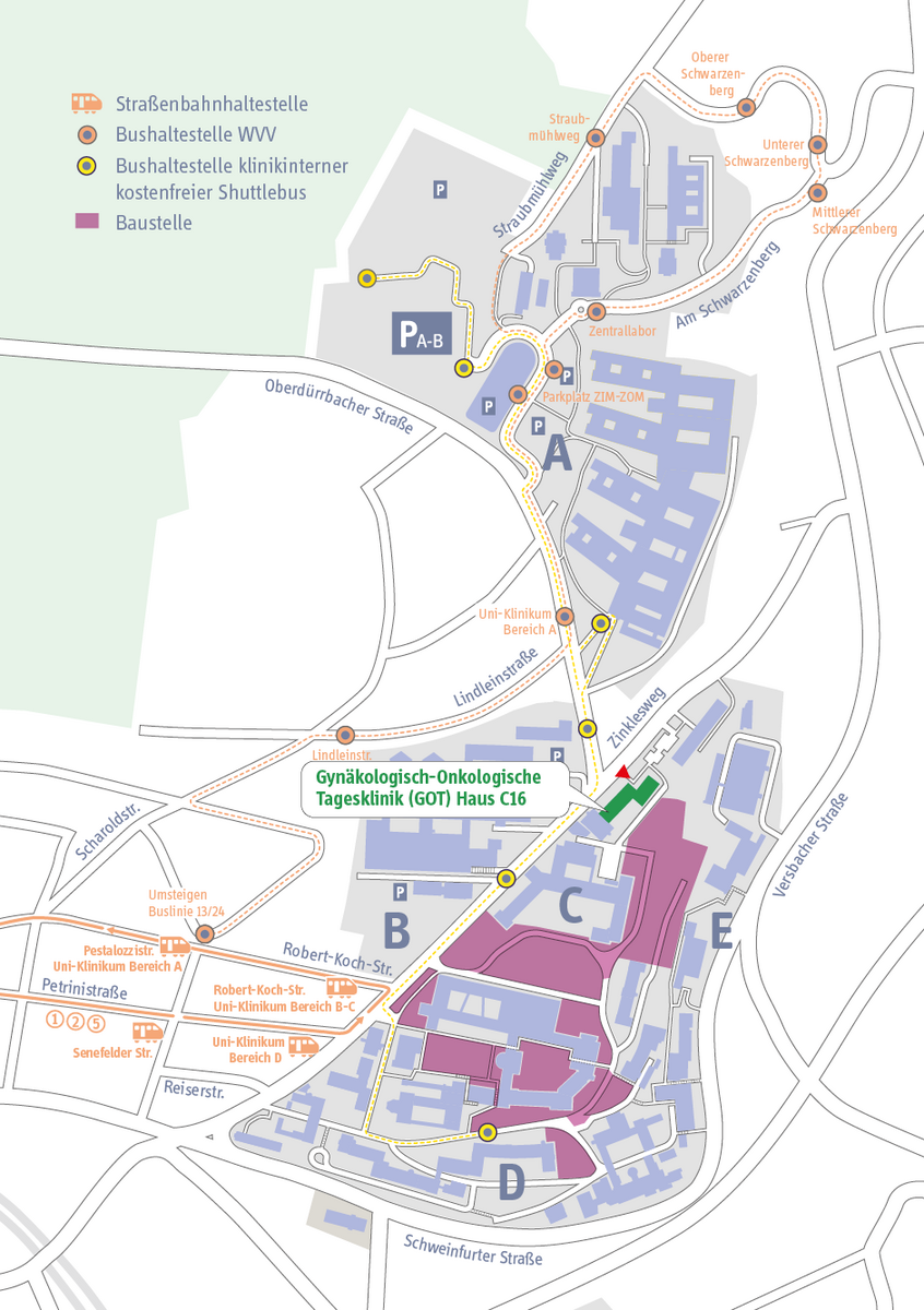 Seit September 2023 ist die Gynäkologisch-Onkologsiche Tagesklinik (GOT)nicht mehr in der Frauenklinik selbst, sondern im Nachbargebäude C16. Sie finden uns in der ersten Etage. Wenn Sie mit dem Aufzug in die 1. Etage fahren, sind Sie direkt im Bereich der GOT. Wenn Sie die Treppe hochkommen, gehen Sie im 1. OG bitte nach links in die GOT.