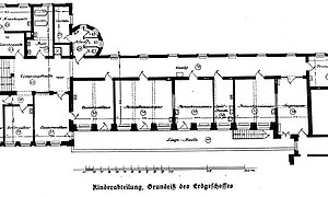 Erstere beherbergten die Stationen für Säuglinge und ältere Kinder, ferner die Pflegerinnenschule, Funktionsräume, Poliklinik, letztere die Isolierstationen für infektiöse Patienten.