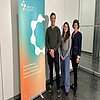 Die drei Forschenden stehen neben einem Roll-up der Joint Action, auf dem der Slogan steht "Strengthening the Personalised Cancer Mecicine Network across Europe