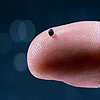 Auf dem Bild sieht man auf einem blauen Hintergrund eine vergrößerte Fingerkuppe auf der eine winzig kleine schwarze Kugel zu sehen ist.